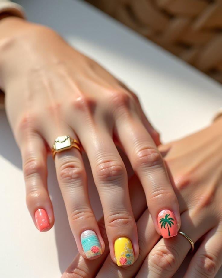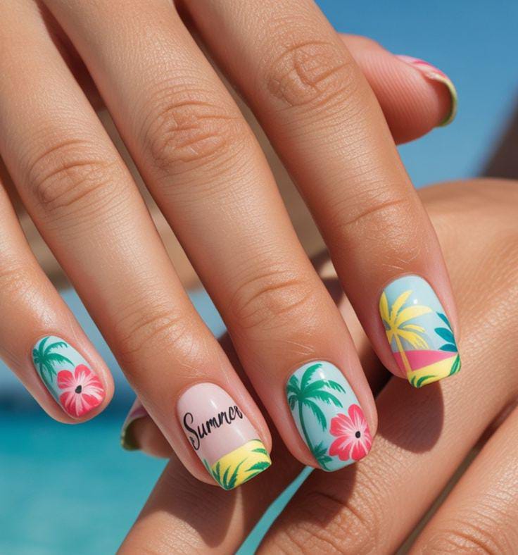 This design has coral, yellow, and turquoise square nail shades with palm trees and beach-inspired art. The vibe is fun, vibrant, and vacation-ready—perfect for a bold summer statement.