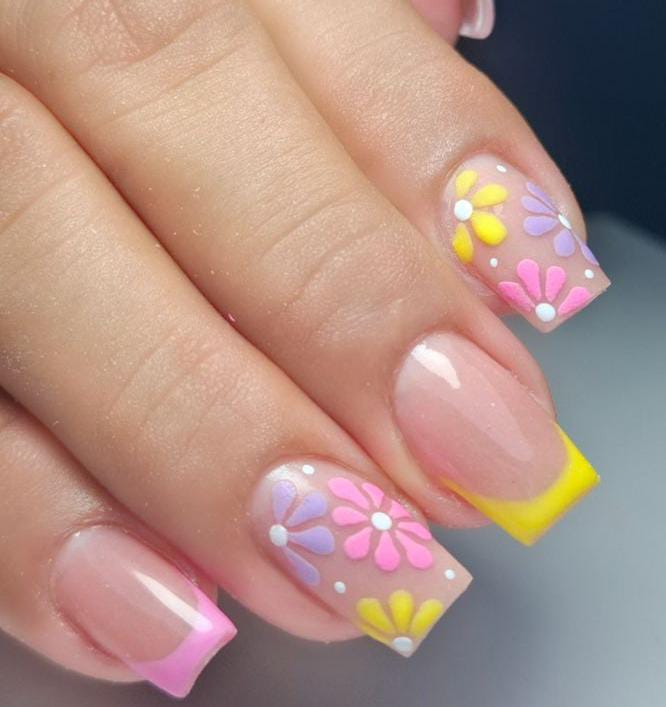 A nude base into pastel French tips, topped with simple painted details in soft pink, yellow, and lavender tones subtle dots. The vibe is feminine and fresh, offering a modern take on classic summer square nails.