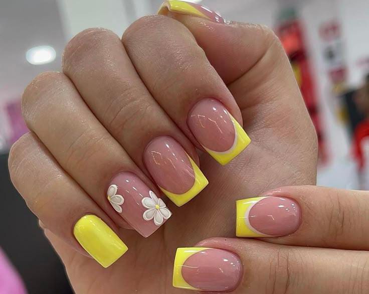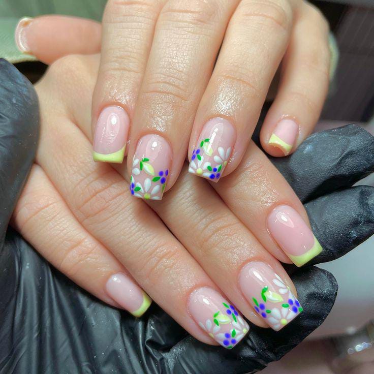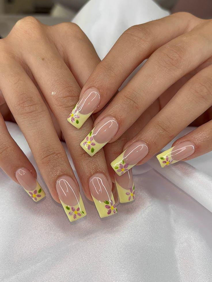 This design features soft nude square nails with pastel yellow French tips and delicate floral accents. The overall vibe is fresh and cheerful, giving a light summer garden feel.