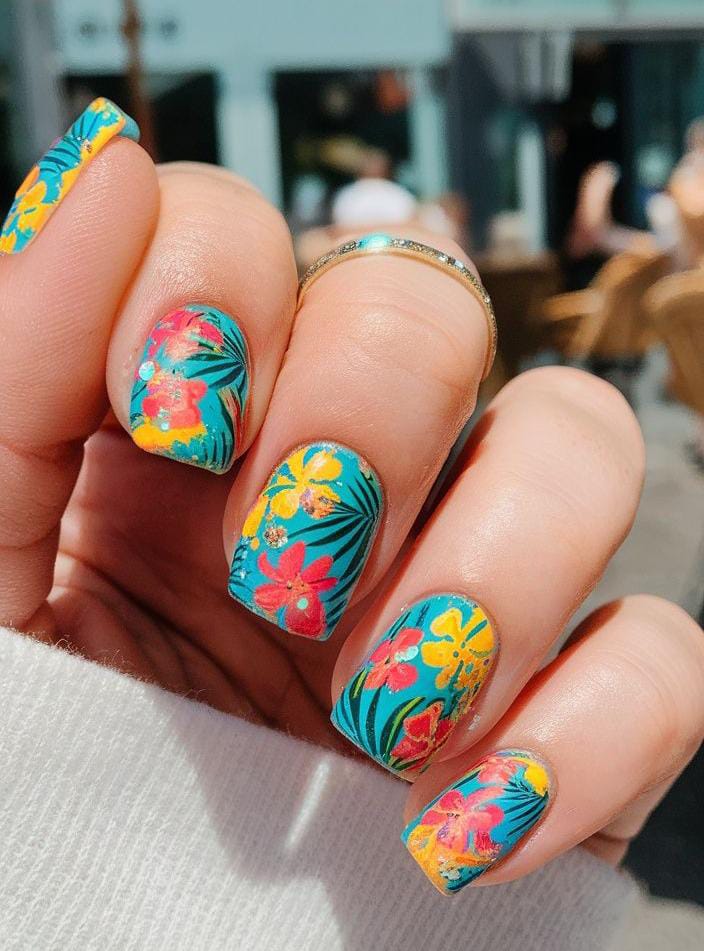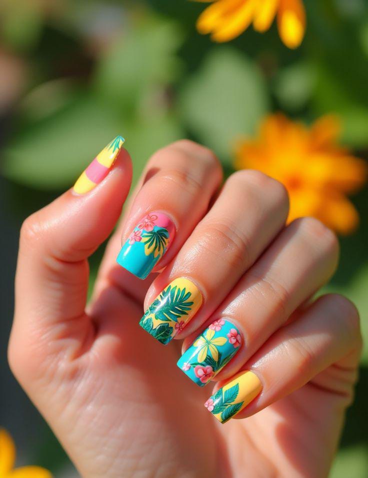 Bright turquoise and warm yellow shades mix with tropical leaf and floral art for a bold summer statement. These nails feel playful, vibrant, and inspired by beach vacations.