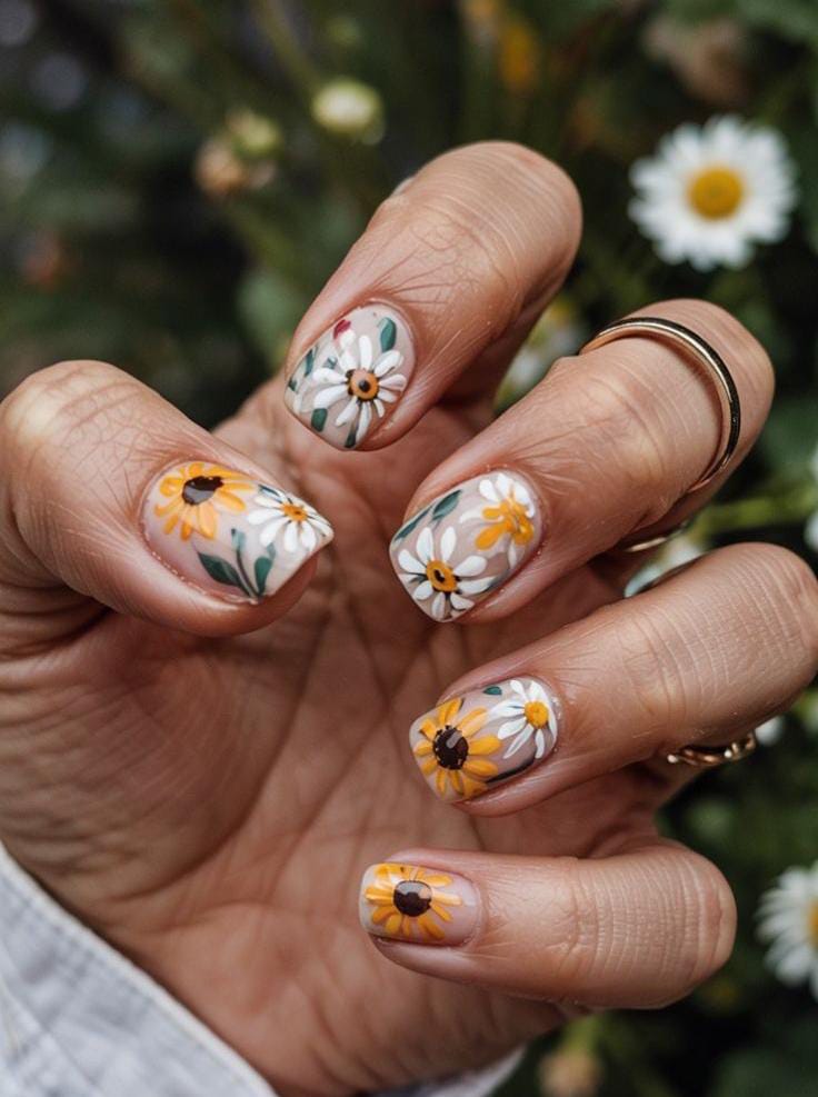Neutral bases are topped with cheerful yellow sunflower-and-white daisy designs across each square nail. The look is cozy yet bright, bringing a happy sunflower-field summer vibe.