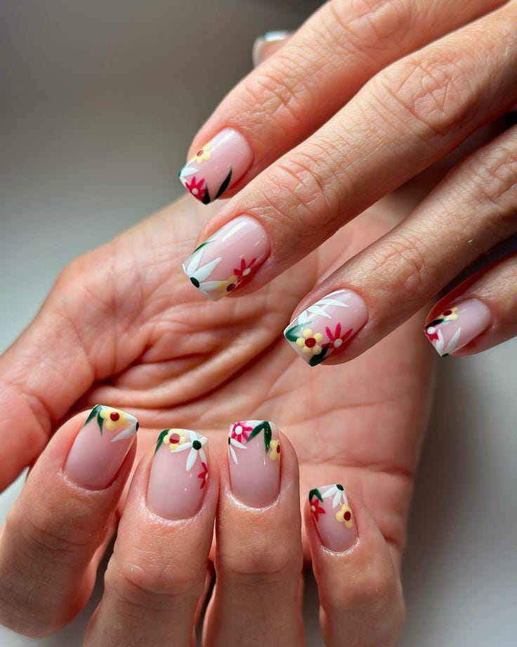 These square nails combine a sheer pink base with soft pastel flowers and subtle French tips. The overall style feels airy and romantic, perfect for a gentle, feminine summer aesthetic.