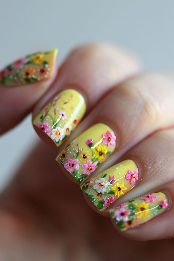 These nails feature a sunny yellow background with tiny pink, yellow and white flowers subtle delicate summer garden aesthetic. The vibe is warm, happy, and inspired by summer fields.