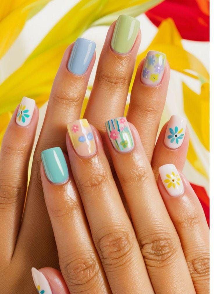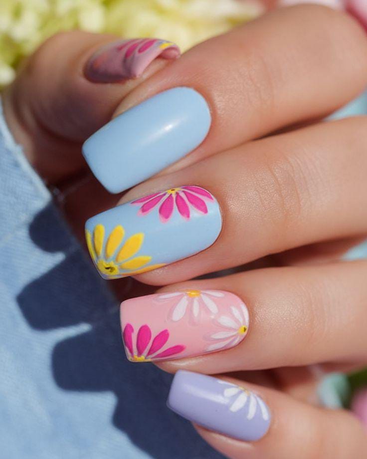Light blue, pink, and lavender square nail shades are paired with simple daisy designs. This look feels soft, cute, and youthful — ideal for a relaxed summer aesthetic.