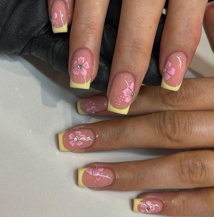Glossy pink nails with pale yellow French tips are finished with delicate floral details and small gems. The design feels elegant yet playful, perfect for summer parties or special occasions.