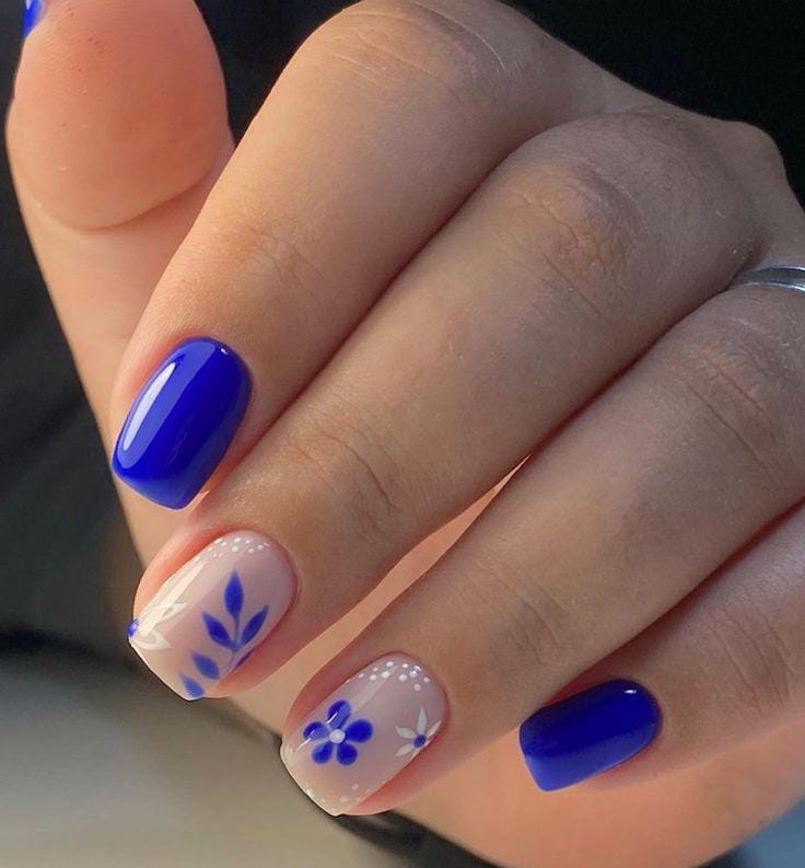 This design mixes glossy royal blue with soft nude bases and delicate floral with tiny dots accents. The overall vibe feels fresh and elegant, with a clean summer look that balances bold color and gentle details.
