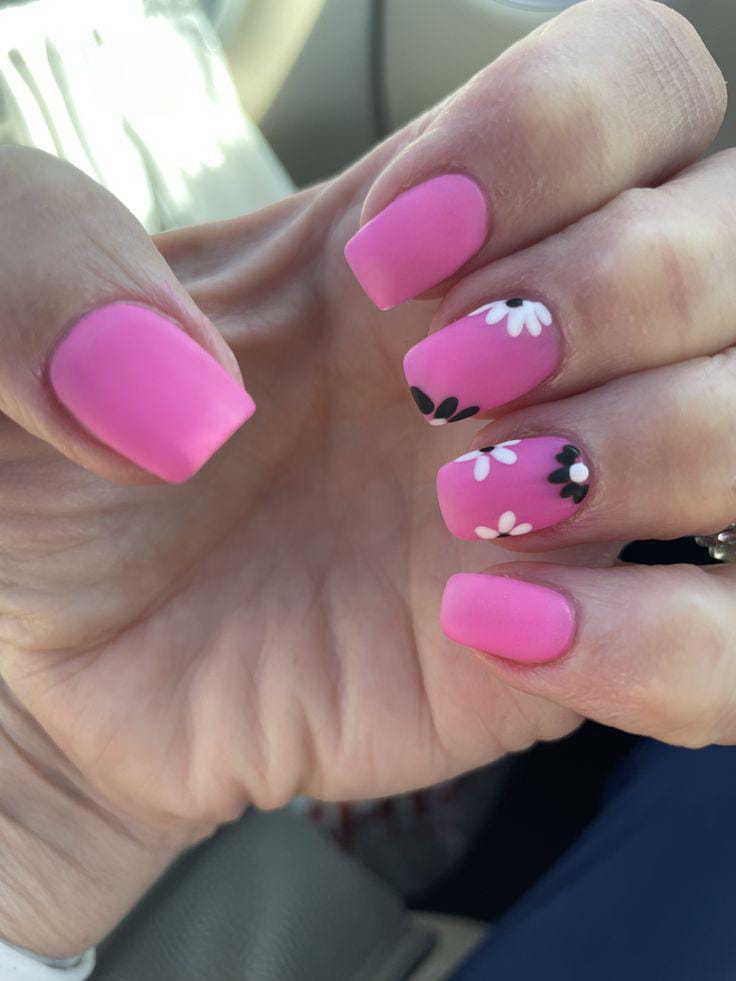 This set uses matte hot pink as the main color, with simple black-and-white flower accents on a couple of nails. The vibe is bold yet cute, giving off a fun, confident summer energy.