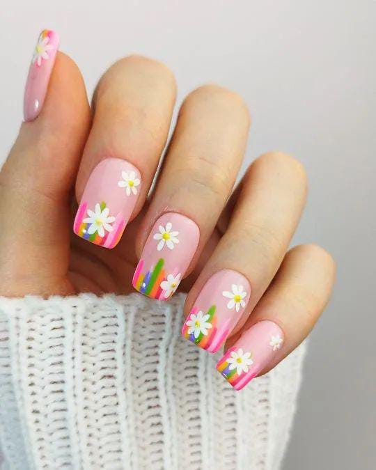 Soft pink square nails get a playful summer upgrade with bright rainbow French tips and cute white daisy accents. The overall vibe is cheerful and artsy, perfect for a fun, colorful summer look.