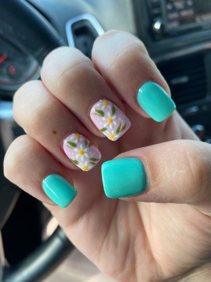 This design mixes glossy aqua square nails with blush-pink accent nails covered in tiny white flowers, dot and leafy details. It feels fresh and light, with a soft floral summer vibe that’s sweet but still modern.