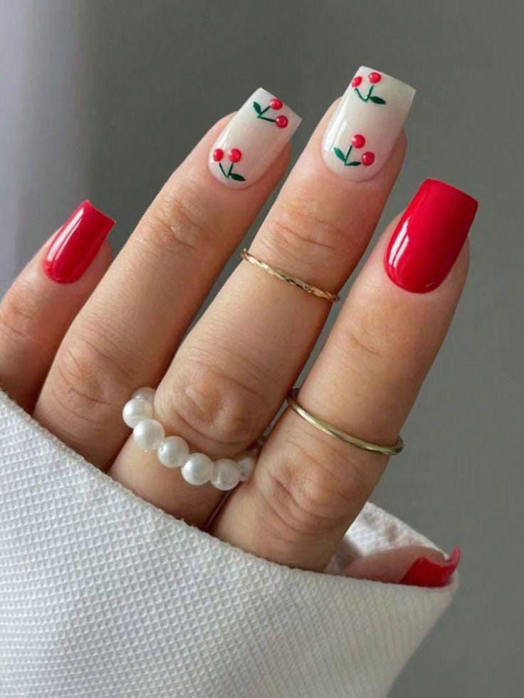 Bold red square nails are paired with milky nude accent nails featuring minimalist cherry art. The look is clean and classy with a cute retro twist, giving off confident summer energy.