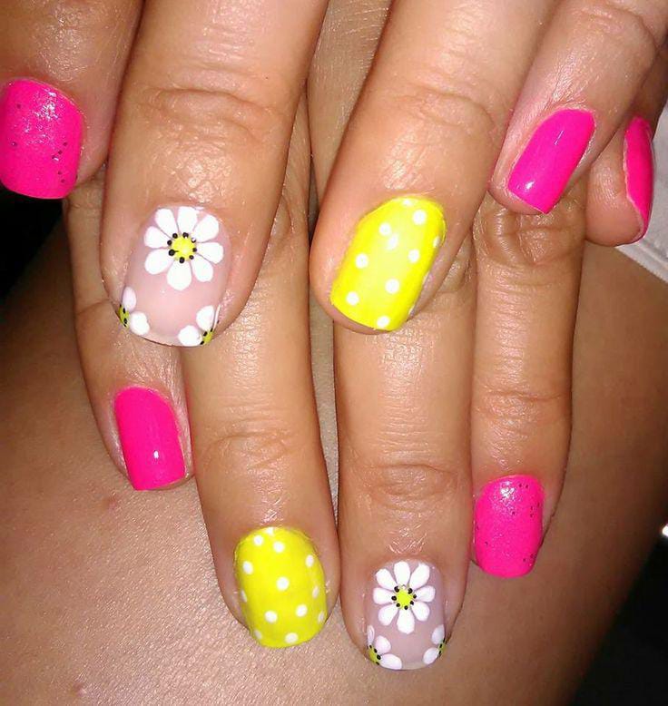 Hot pink and sunny yellow square nails steal the spotlight, while sheer accent nails show off big white daisies and playful polka dots. The bright colors create a bold, youthful vibe that feels perfect for summer fun.