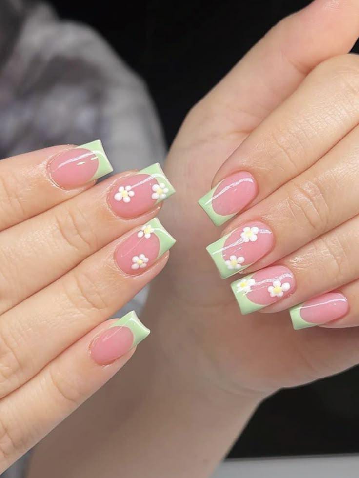 Classic square French tips are refreshed with pastel green edges and delicate white flowers over a glossy pink base. This design feels soft, elegant, and airy — a calm, pretty take on summer florals.