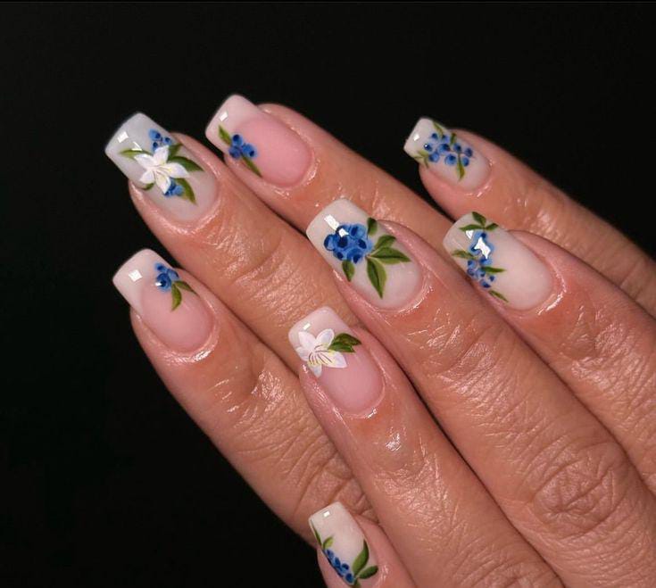 Classic square French tips are refreshed with hand-painted blue berry and white floral accents placed delicately on the leaves across the nails. The design feels elegant and polished while still embracing a soft summer aesthetic.
