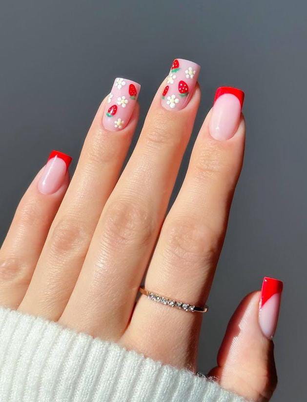 These square nails combine glossy red French tips with tiny strawberry and flower details on a soft pink base. The design feels fun, youthful, and sweet, capturing a playful summer mood.