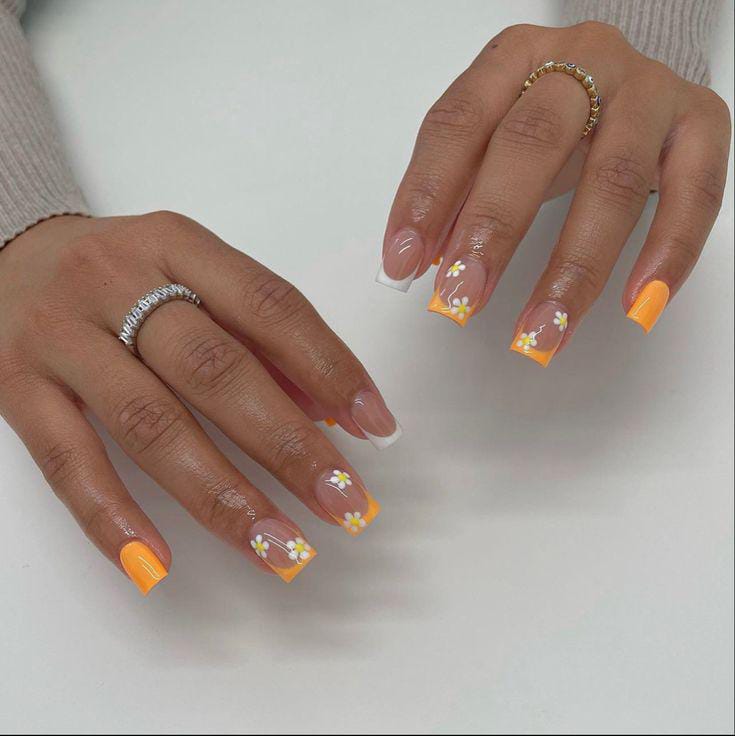 A modern take on French tips, this look combines crisp square nails with bright orange and white edges. Small white floral details on nude base give it a clean yet lively summer aesthetic.