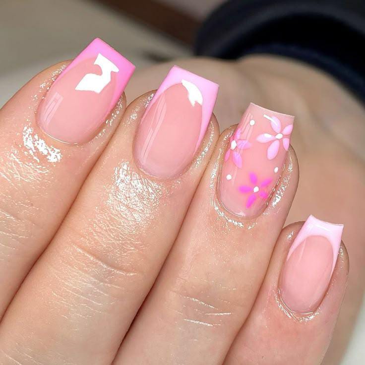 These square nails mix a natural blush base with soft pink French tips for a polished look. The gentle floral and dot accents keep the design light, elegant, and perfect for a soft summer style.
