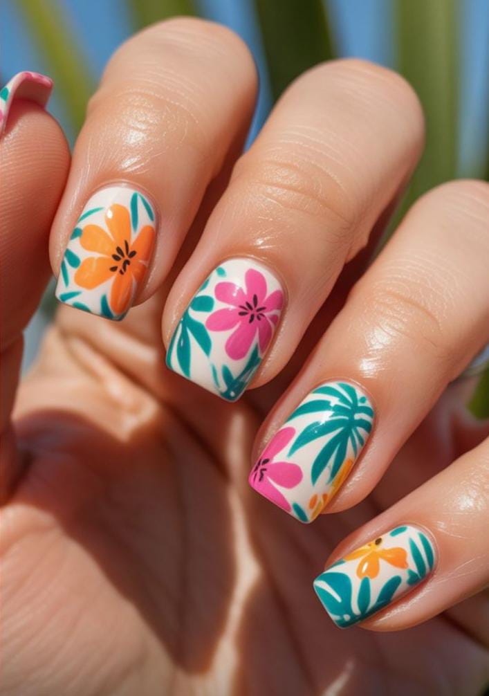 Creamy bases decorated with bright pink and orange flowers with leaves create a cheerful tropical look. The square shape keeps it polished while the floral patterns add sunny island summer energy.