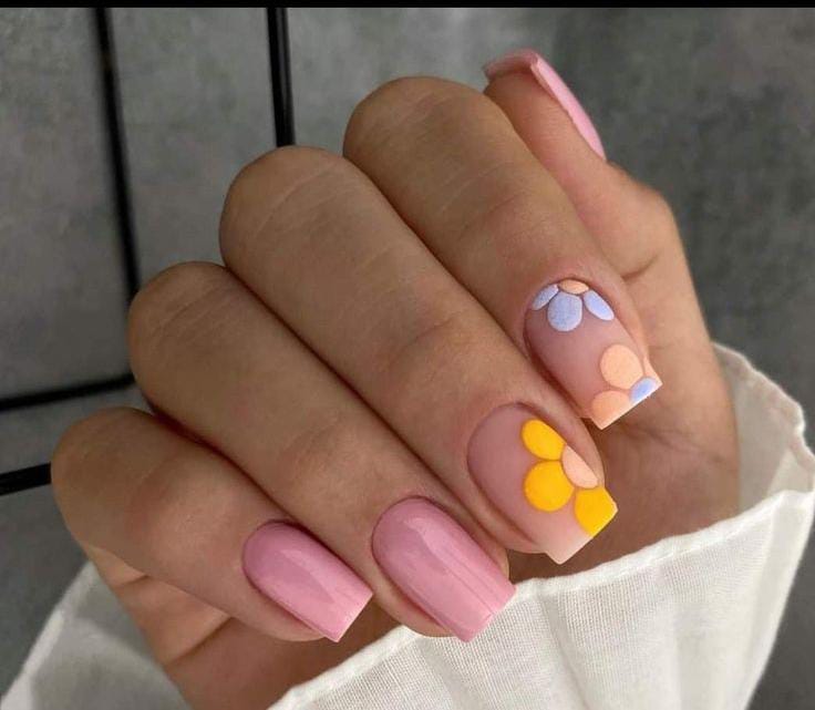 Muted pink square nails are paired with abstract pastel petal designs in yellow, peach, and lavender. The look feels modern, artsy, and playful while still staying soft and wearable for summer.