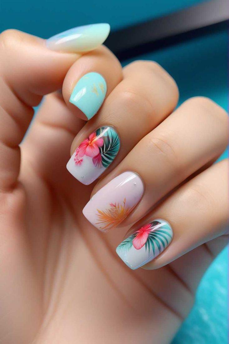 Pastel aqua and blush square nail shades combine with tropical flowers and leafy details. This design feels light, elegant, and fresh — a perfect balance of soft colors and summer charm.