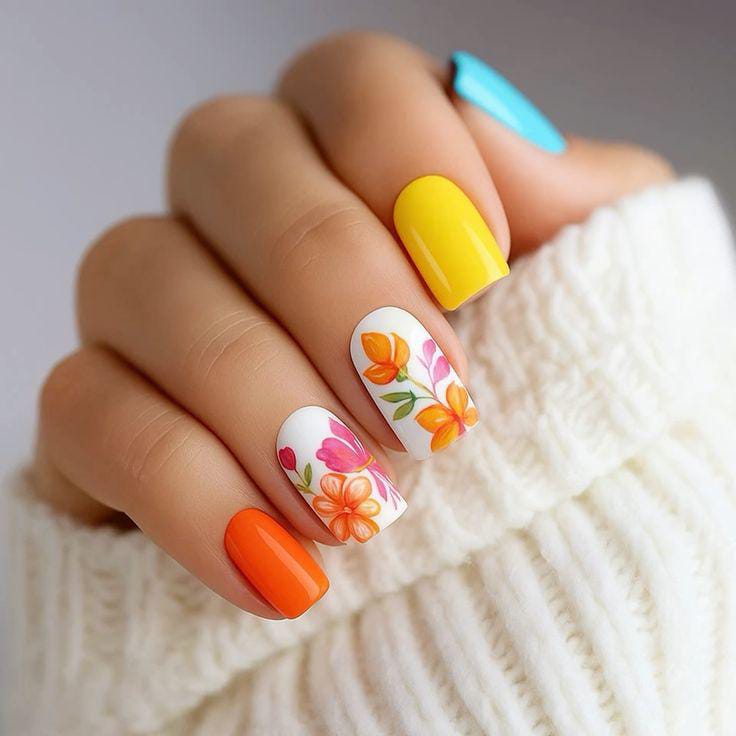 Bright summer shades like yellow and orange mix with soft white bases and hand-painted floral leaves on square nails. The overall vibe feels cheerful and fresh, combining bold solids with delicate artwork for a playful yet balanced summer look.
