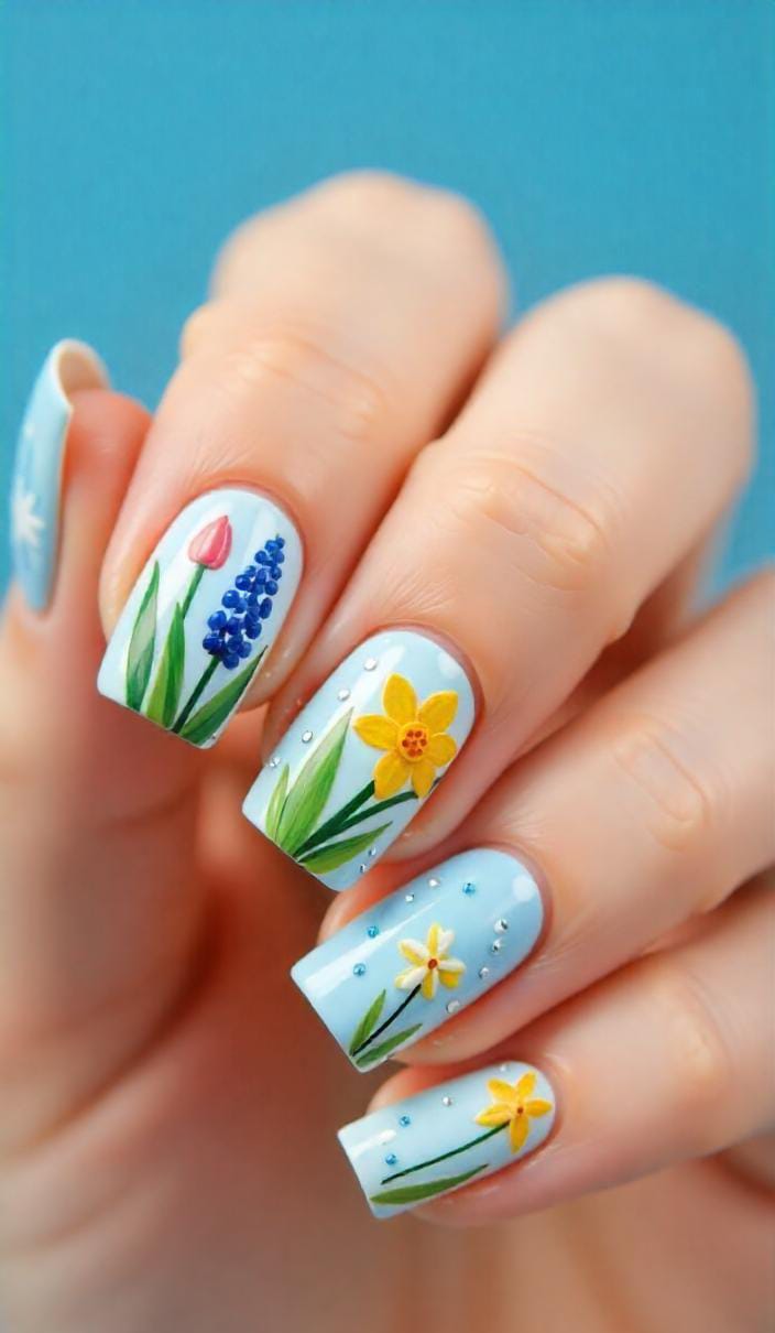Soft baby-blue polish sets the stage for gentle pastel artwork in yellow, pink, and blue blanched with green leaves, finished with subtle sparkle and rhinestone. This design feels calm and sweet, perfect for bright summer days.