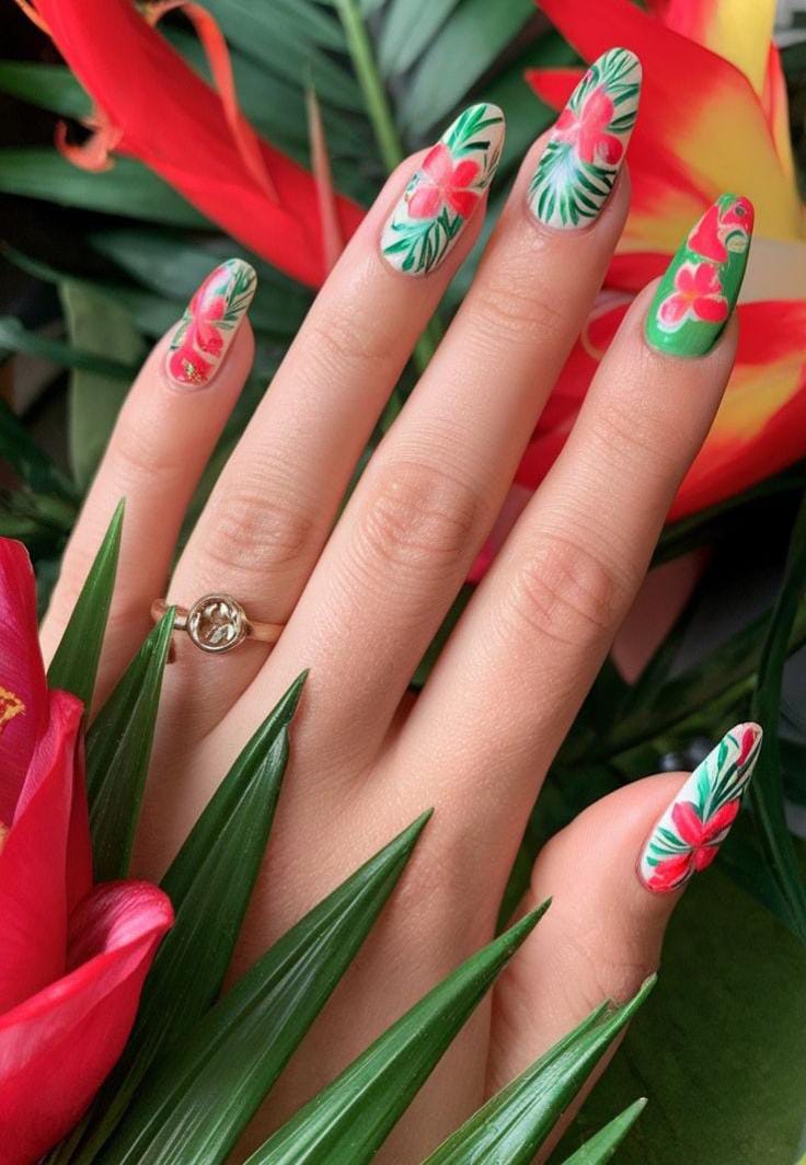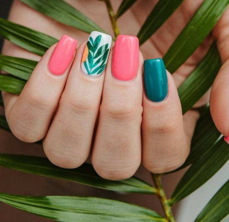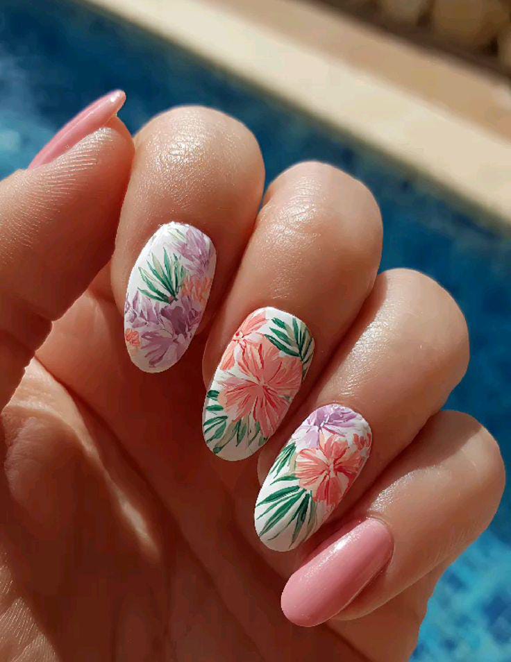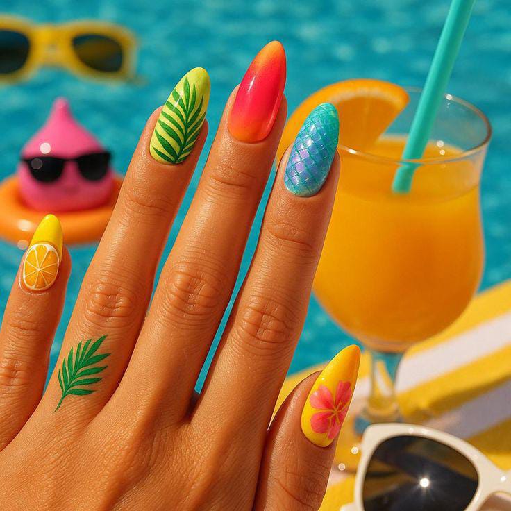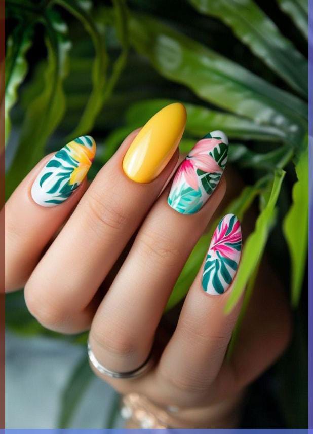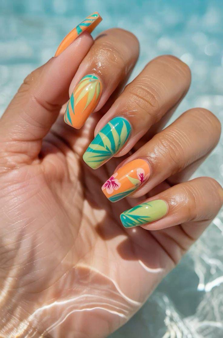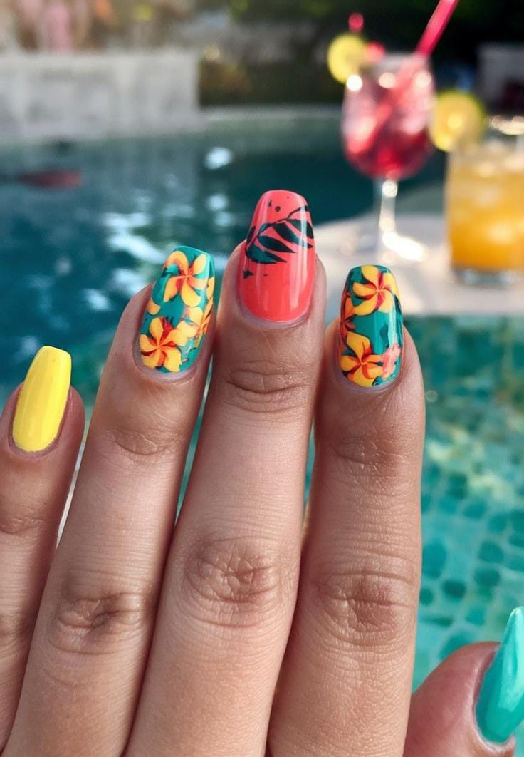 These nails feature bright, tropical colors with floral and leafy patterns that instantly feel beachy and fun. The mix of teal, coral, and yellow gives off a fresh, sunny summer vacation vibe.