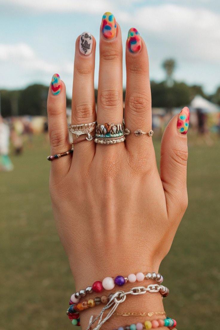 These nails have a bright, playful mix of colors with abstract confetti-like dots and swirls. Delicate subtle black floral-like confetti on single cream accent nail. The overall vibe feels fun, artsy, and perfect for summer vacation or outdoor events