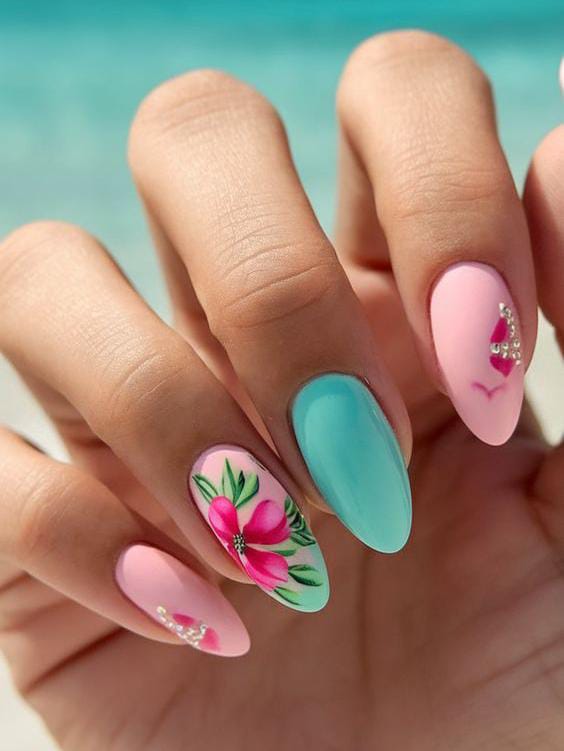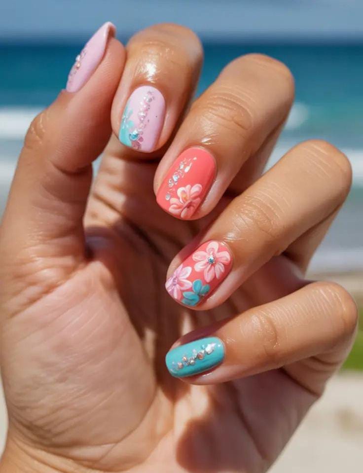 Soft pastel shades blue, coral, and baby pink mix with tiny floral accents and rhinestones finish. The look is light, fresh, and gives off relaxed beach-day summer energy.