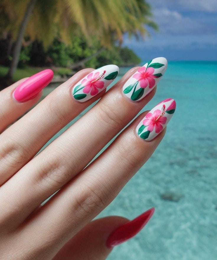 Bold pink flowers and leaves sit on clean, white bases with a single pink accent nail. The design feels tropical, sunny summer and perfect for a seaside vacation mood.