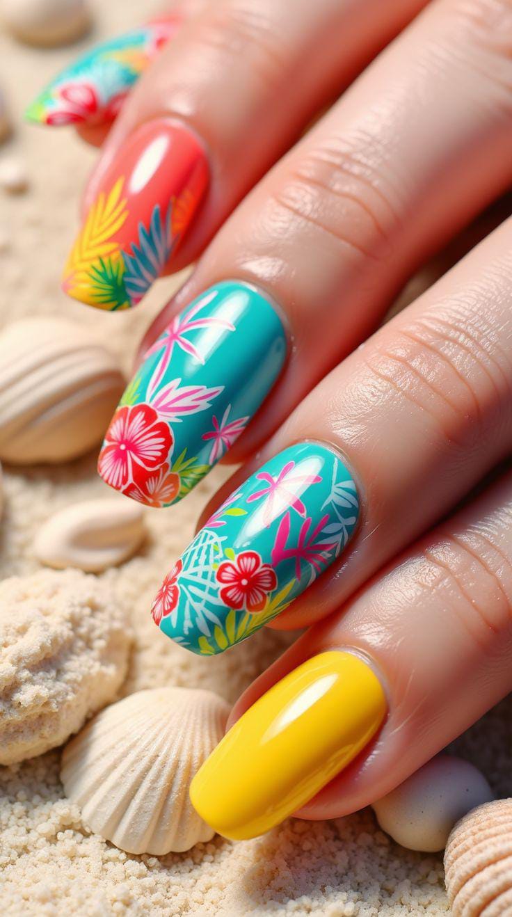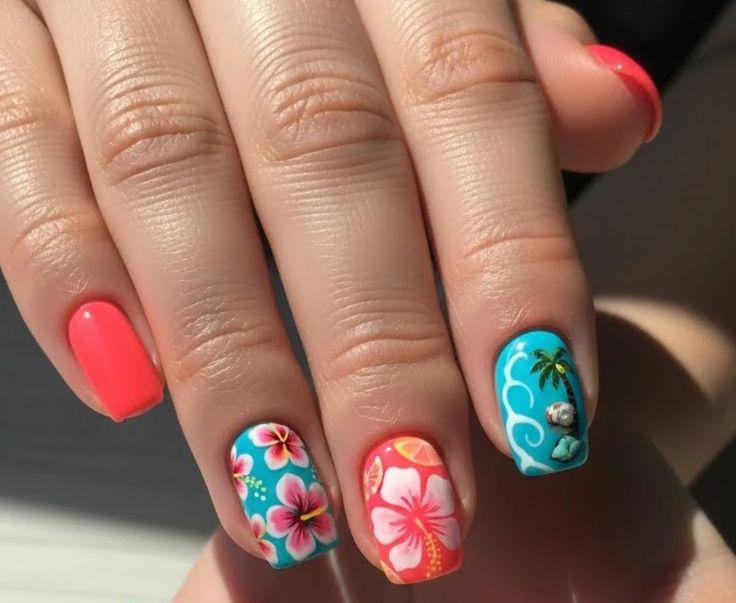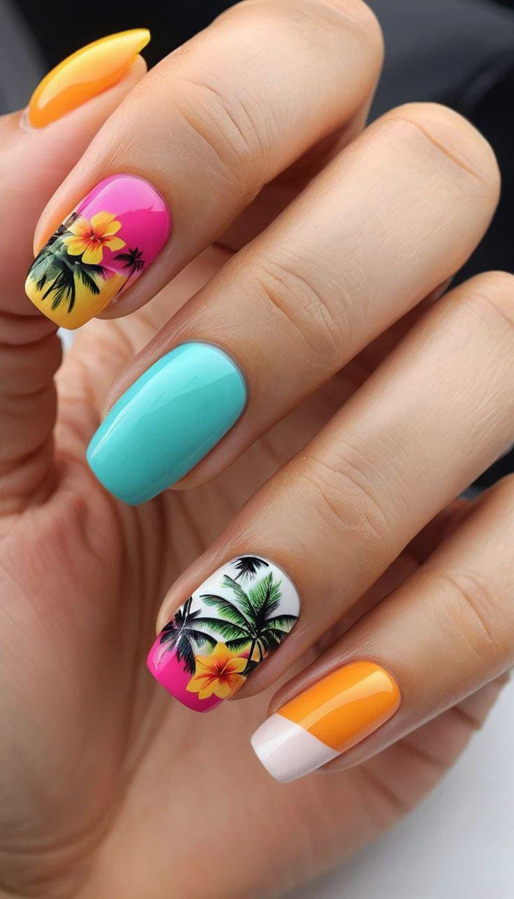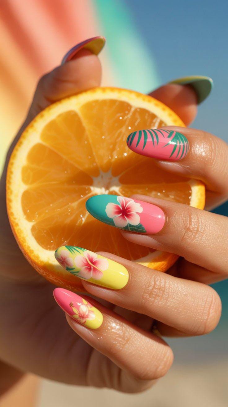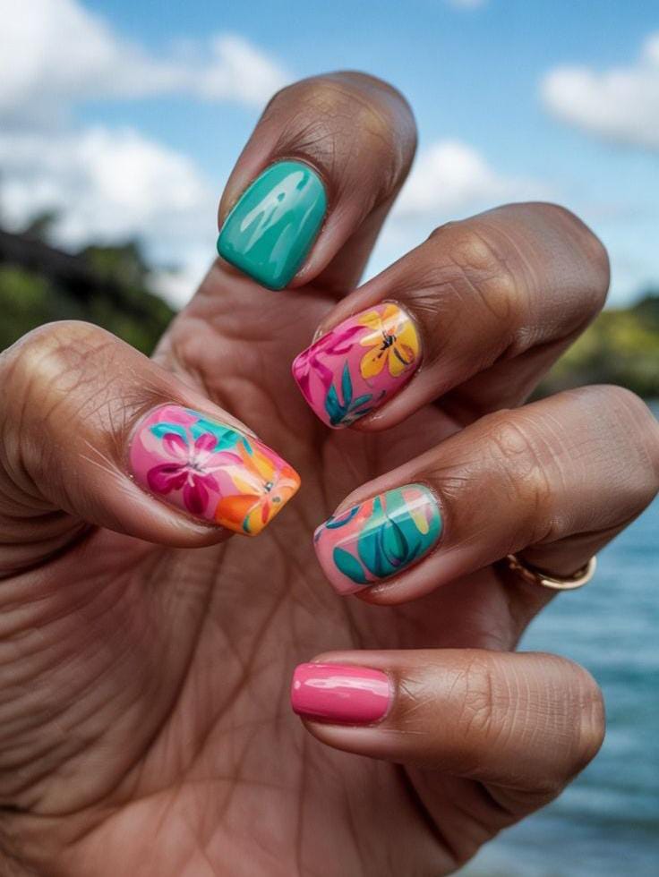Vibrant tropical colors and hand-painted flowers create a lively, cheerful look. The mix of teal, pink, and warm tones gives these nails a bold summer holiday vibe.