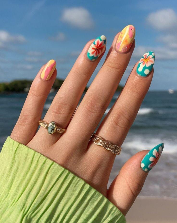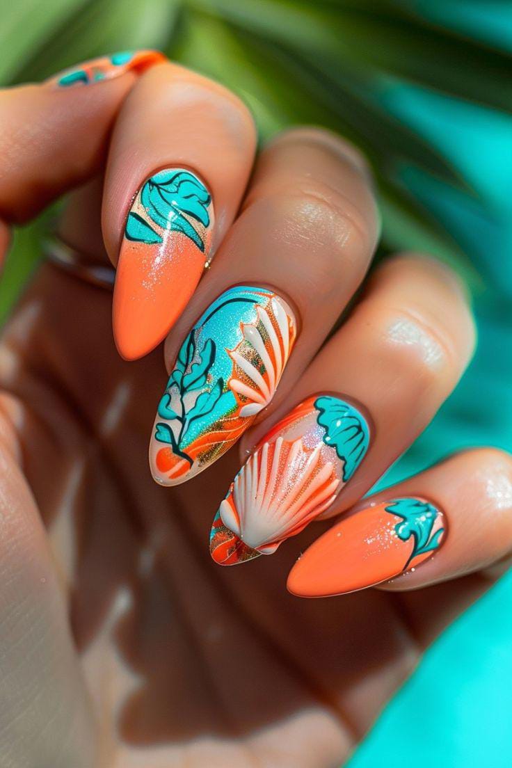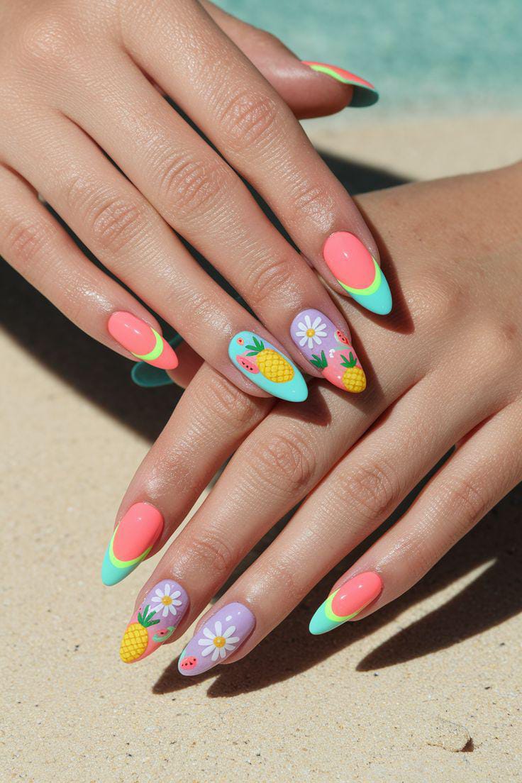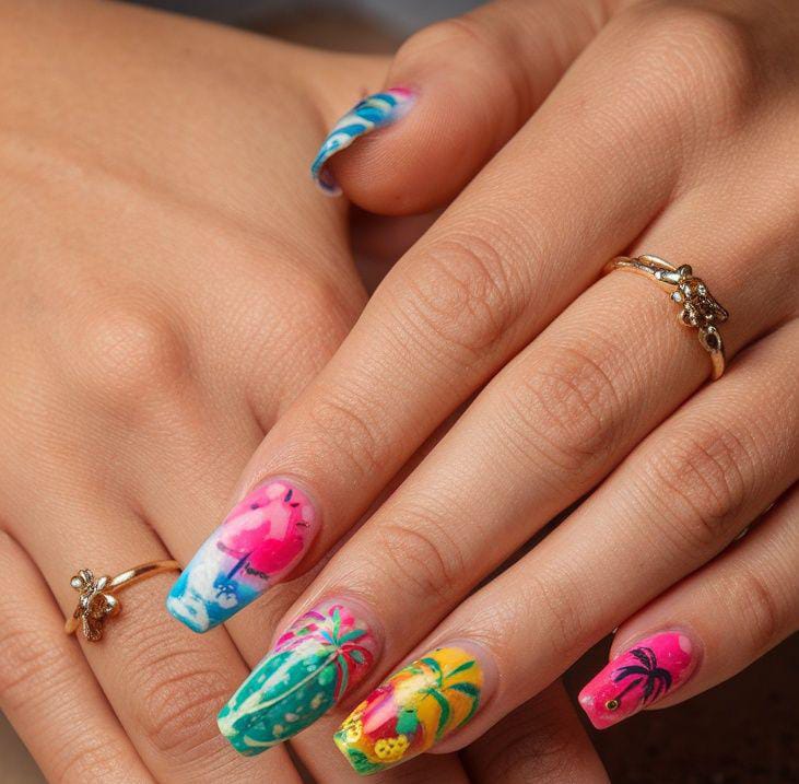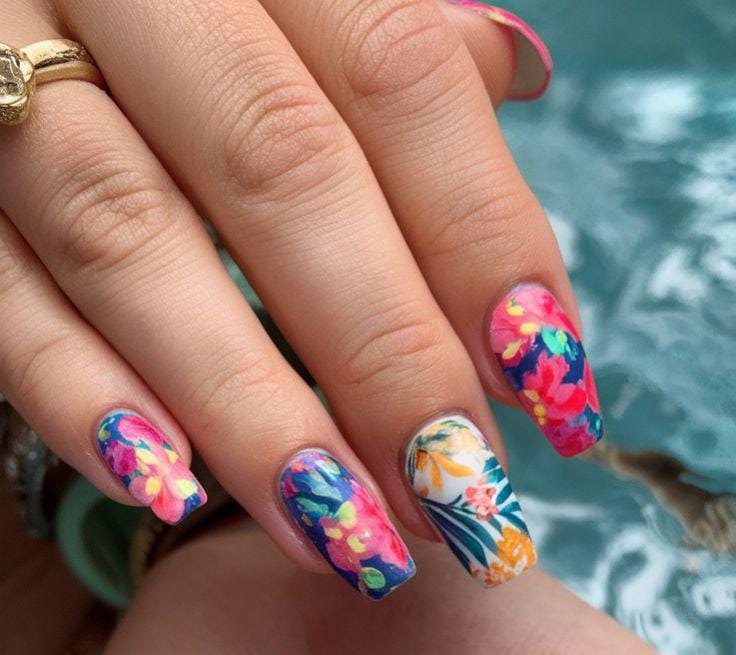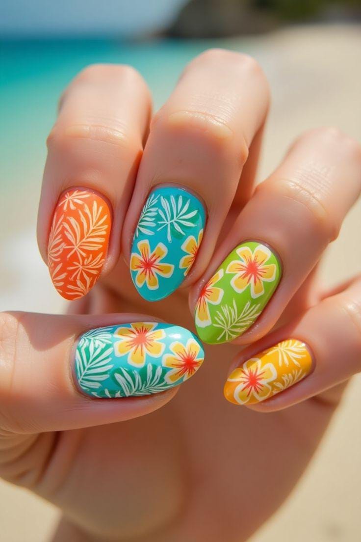 Vibrant tropical colors and hand-painted flowers create a lively, cheerful look. The mix of teal, pink, and warm tones gives these nails a bold summer holiday vibe.