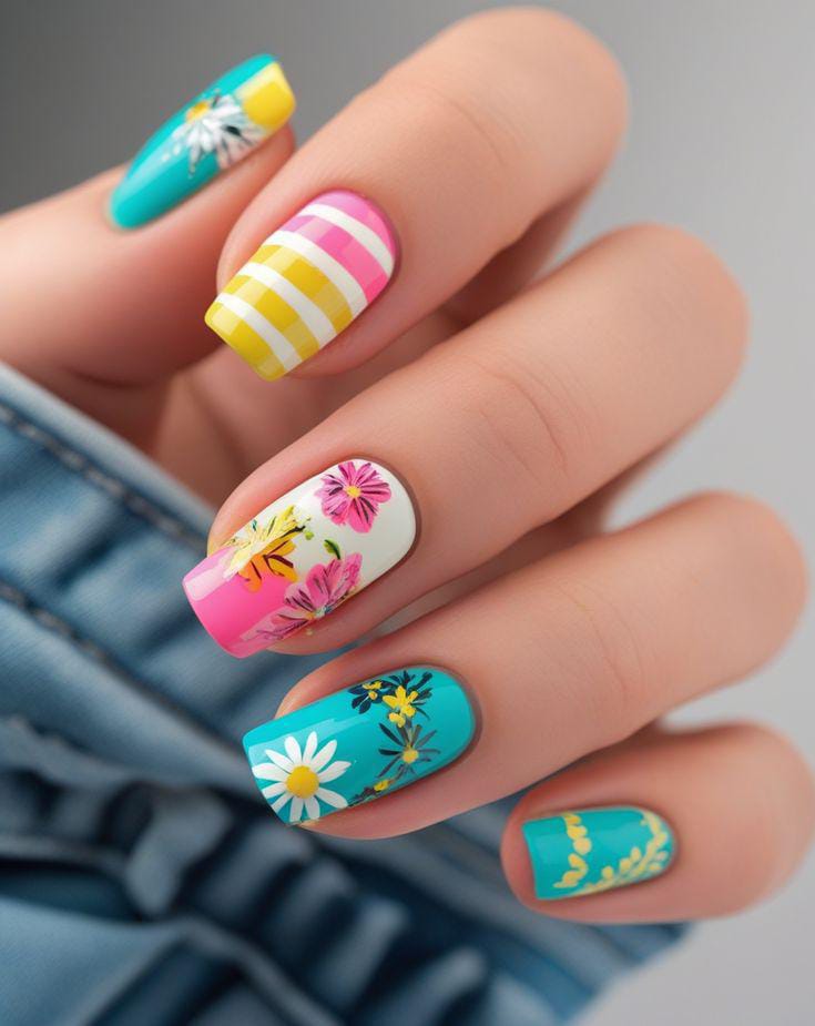 Bright teal, pink, yellow, and white create a cheerful summer color palette. The mix of stripes and floral patterns makes the nails feel fun, lively, and perfect for sunny summer vacation days.