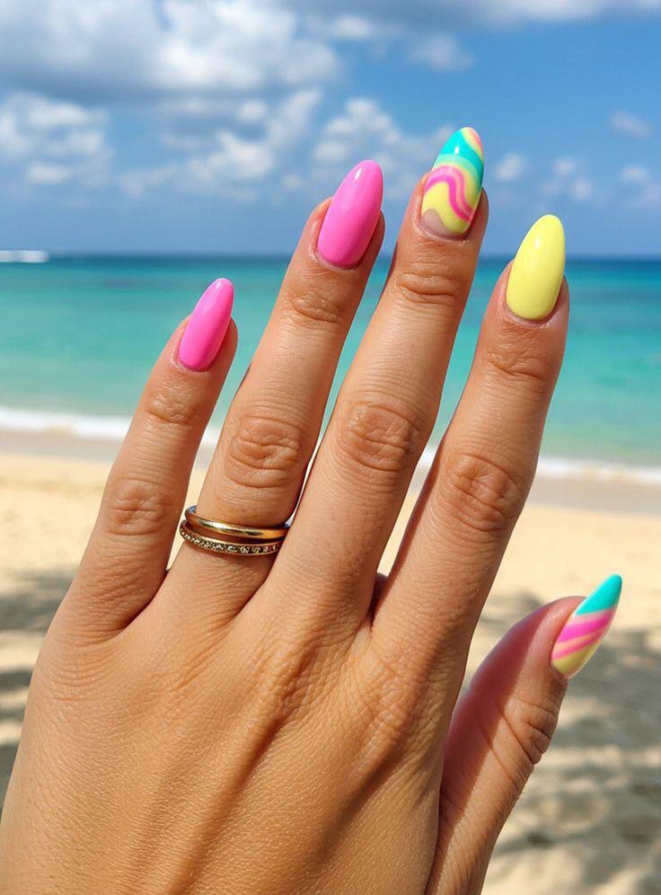 Bright pink, yellow, and blue shades mix with playful swirl accents for a bold summer statement. The vibe is fun, sunny, and perfect for beach days or vacations.