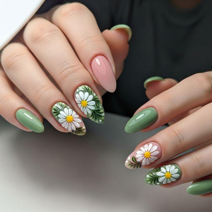 This set combines gentle green shades with delicate daisy florals and leaves for a soft, fresh vibe. It feels light pink, natural, and perfect for peaceful summer vacation days.