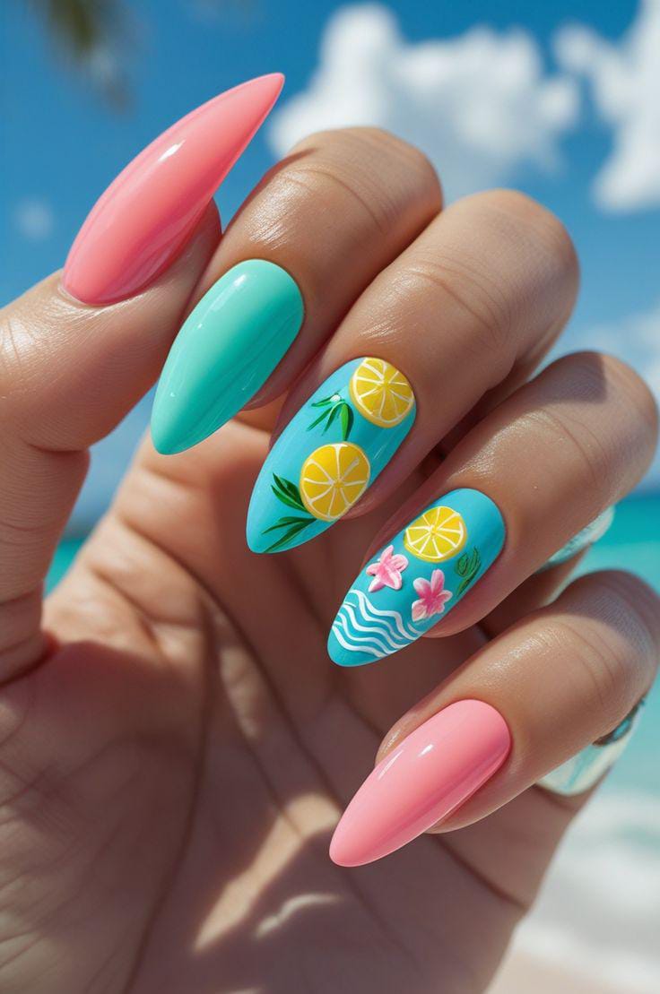 This nail design has a fun, summery vacation vibe with bright, cheerful colors that instantly feel beach-ready. The mix of turquoise, coral, yellow, and soft pink paired with playful floral and abstract patterns gives it a relaxed, tropical holiday feel.