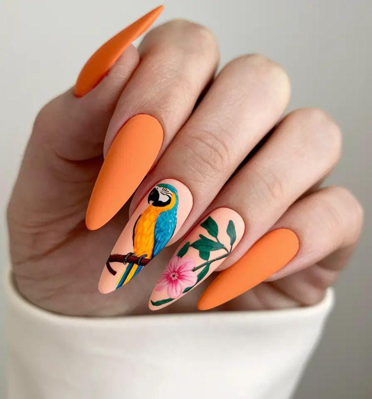 Bold orange nails are mixed with a colorful parrot, floral and leaf branch on peach accent nails for a lively tropical feel. The design feels vibrant, playful, and full of summer vacation energy.