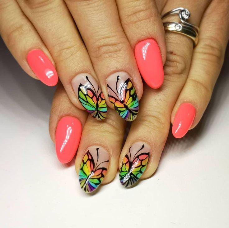 This design mixes bright coral and natural nails with colorful butterfly art for a bold, playful summer look. The overall vibe is fun, vibrant, and perfect for sunny vacation days.