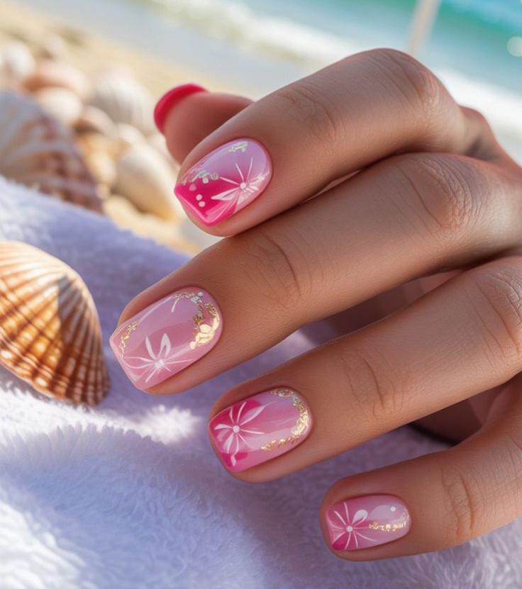 These nails feature soft pink and bright shades with delicate white floral details and subtle gold accents. The style feels calm, romantic, and beachy, perfect for relaxed summer holidays.