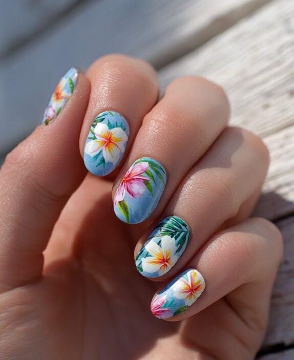 This look combines a soft blue background with bright tropical flowers and leafy accents. The design feels fresh, airy, and inspired by island summer vacations and warm ocean breezes.