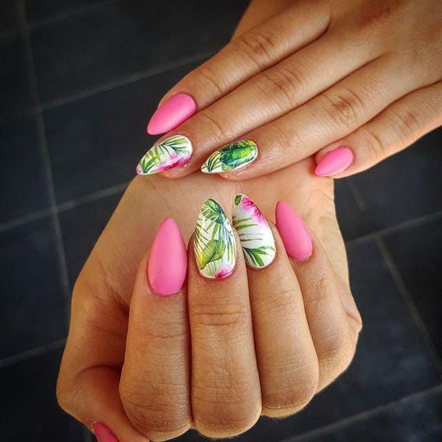 Bright pink nails are paired with tropical leaf designs on white base for a bold summer contrast. The overall style feels fun, tropical, and perfect for sunny vacation days.