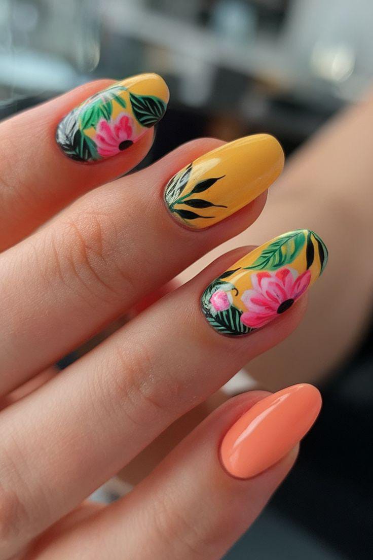 Warm yellow and peach shades are paired with bold floral accents and leafy details for a sunny summer, vacation-ready look. The style feels cheerful and lively, like a tropical getaway in nail form.