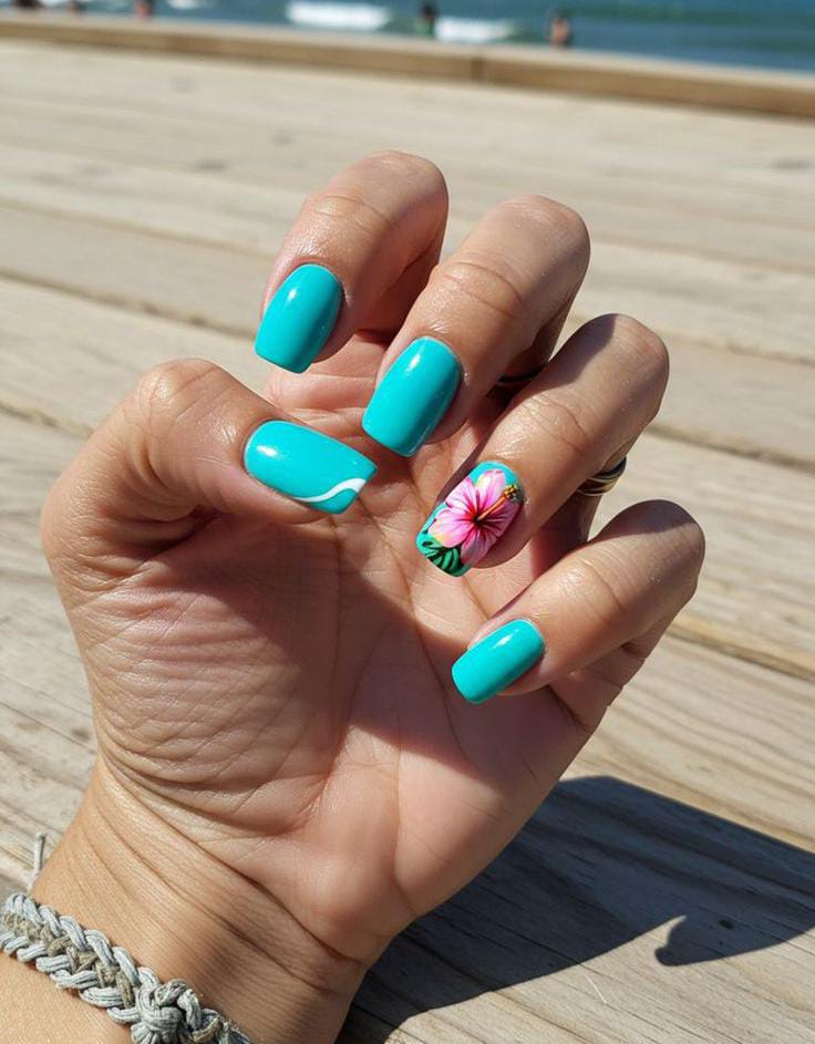 Bright turquoise nails are balanced with a single floral accent that adds a fun tropical summer touch. The clean, glossy finish gives it a fresh, poolside vacation vibe that feels simple but eye-catching.
