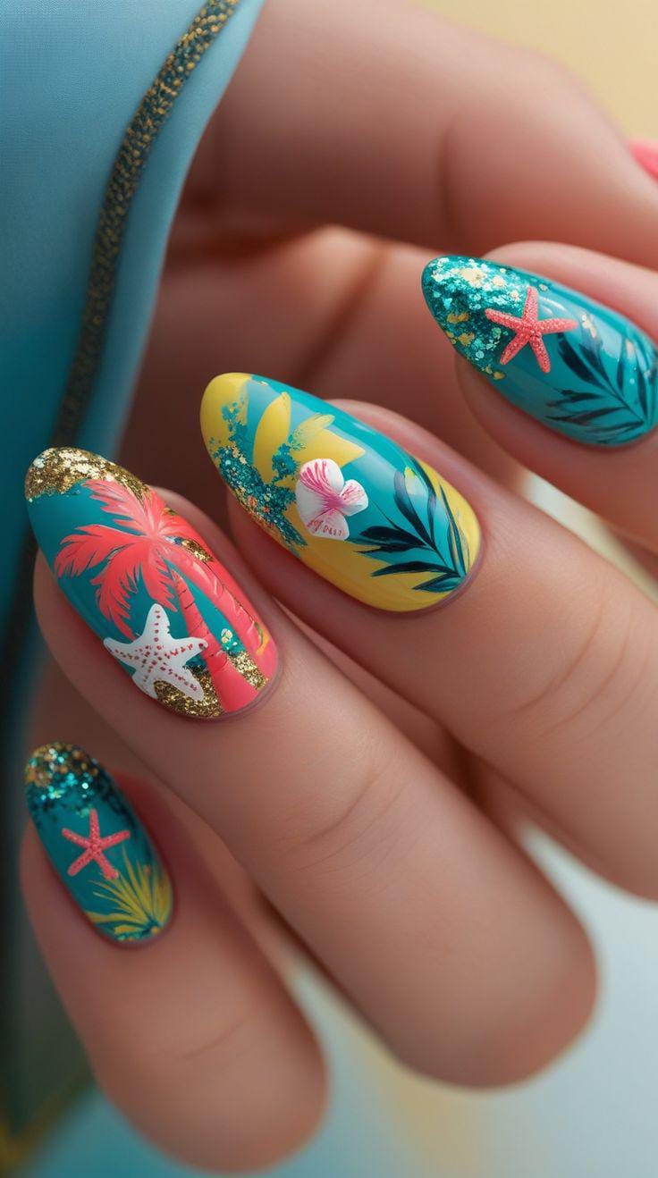 These nails feature tropical florals, leafy, palm tree, star fish details, and hints of glitter on a teal and yellow base. The overall vibe feels like a dreamy beach resort with a touch of summer glam.