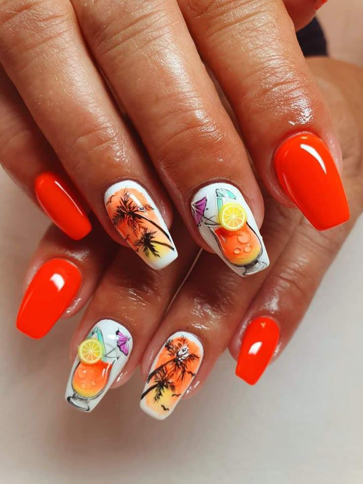 Bright orange nails are paired with tiny palm trees, flying birds and fruity drink art on white base for a fun summer vacation mood. The design feels lively, playful, and perfect for beach evenings.