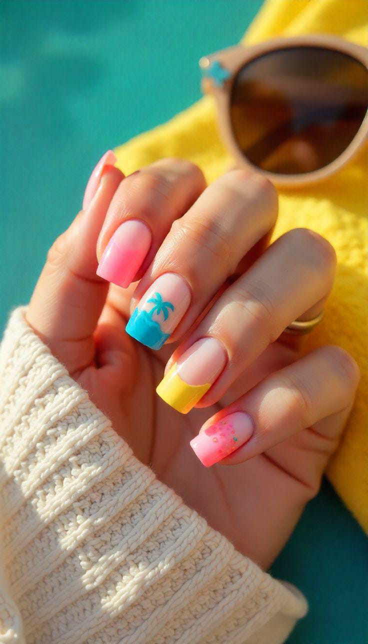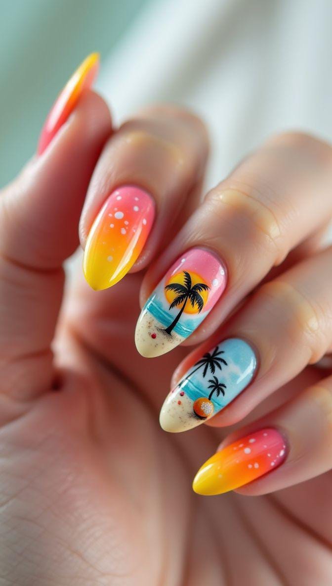 These nails mix warm sunset ombre gradients with soft pinks, yellows, and ocean blues. The palm tree dots accents and beachy scenes give off a chill, tropical vacation vibe.