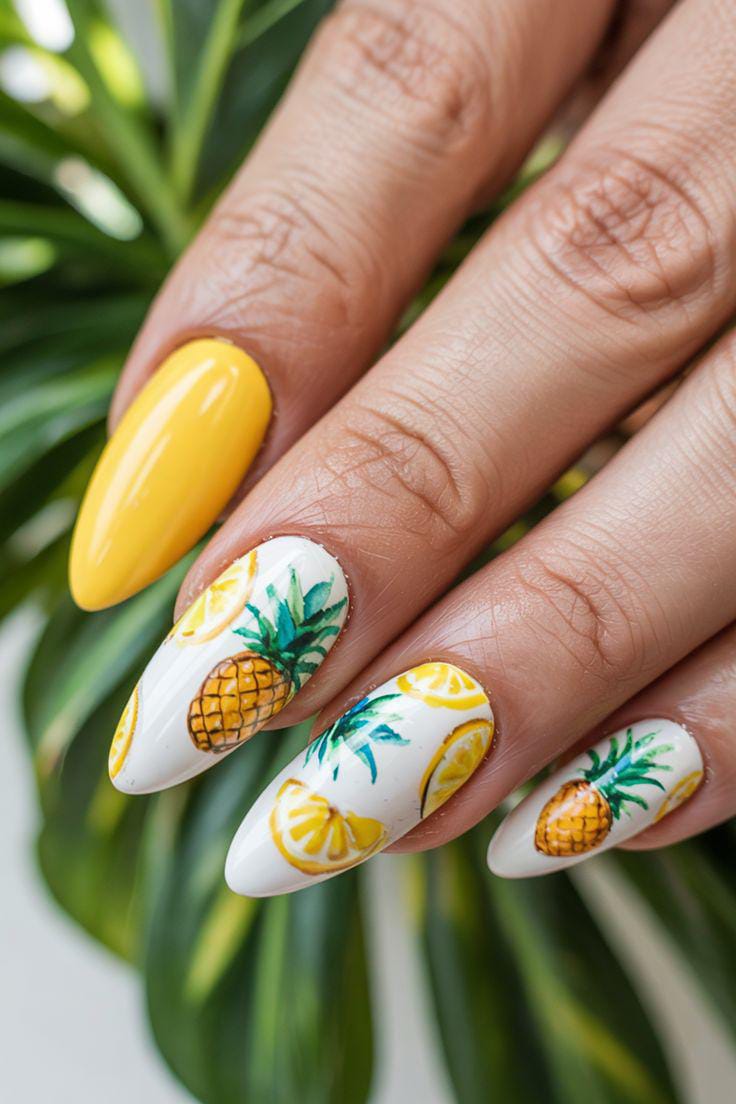 Bright yellow and crisp white set a fresh, summery base with cute pineapple and lemon designs. The look feels playful, juicy, and perfect for sunny summer vacation days.