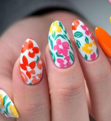 Bold, colorful florals and leaves cover the nails with a hand-painted, artsy feel. The mix of vibrant blues, pinks, and orange gives off a carefree beach vacation summer energy.