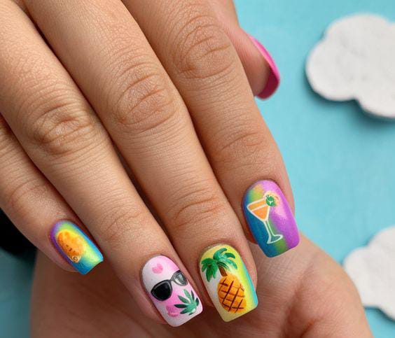 These nails mix bright, candy-like ombre colors with fun summer icons like palm trees, pineapples, and drinks. The vibe is playful and cheerful, perfect for a fun holiday mood.
