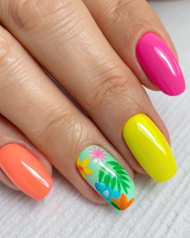 Bright, glossy neon yellow, bright pink and coral shades mix with a playful floral and leaves on mint accent nail for a fresh, vacation-ready look. The bold colors feel fun and energetic, giving off strong tropical summer vibes.