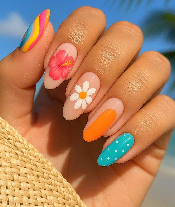 Soft nude bases are paired with cheerful polka dots, flower art and pops of turquoise, orange, and yellow swirls. The overall style feels light, sunny, and perfect for relaxed beach days.